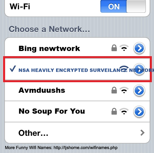 Funny WiFi Name #7550 [NSA HEAVILY ENCRYPTED SURVEILANCE NETWORK ]