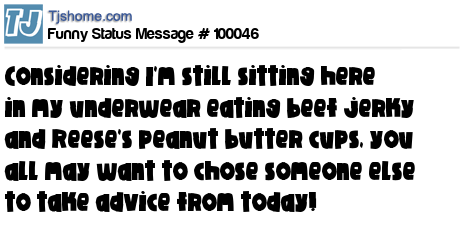- # 94693 Considering I'm sitting here in my underwear eating beef jerky and Reese's peanut butter cups, you may want to chose someone else to take advice from today, guys.