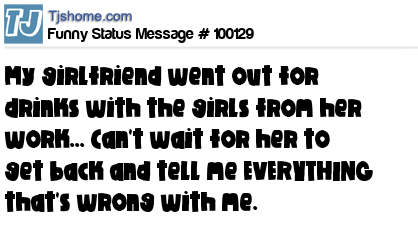 - # 127197 Yup, My girlfriend went out for drinks with the girls from her work... Can't wait for her to get back and tell me EVERYTHING that's wrong with me.