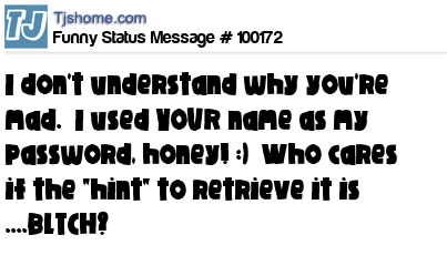 X I don't understand why you're mad. I used YOUR name as my password, honey! :) Who cares if the "hint" to retrieve it is ....BlTCH?