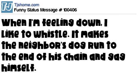 X says When I'm feeling down, I like to whistle. It makes the neighbor's dog run to the end of his chain and gag himself.