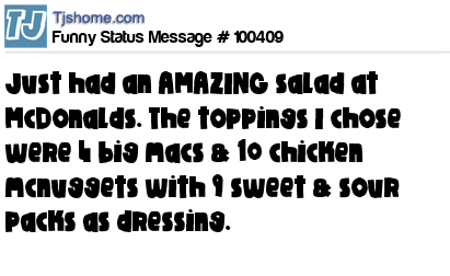 X says just had an AMAZING salad at McDonalds. The toppings I chose were 4 big macs & 10 chicken mcnuggets with 9 sweet & sour packs as dressing.