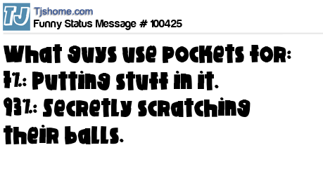 X says What guys use pockets for: 7%: Putting stuff in it. 93%: Secretly scratching their balls.