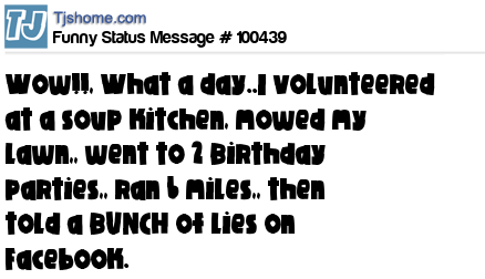 X Wow!!, What a day..I volunteered at a soup kitchen, mowed my lawn,, went to 2 Birthday parties,, ran 6 miles,, then told a BUNCH of lies on Facebook.