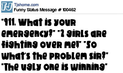 - # 76585 MAN: Hello! Is this 911? POLICE: Yes! What's Ur emergency??! MAN: Two girls are fighting over me! POLICE: What's wrong with that??! MAN: The ugly one is winning.... Hurry!!!
