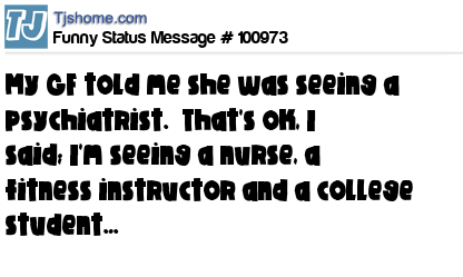 X says My GF told me she was seeing a psychiatrist. That's ok, I said; I'm seeing a nurse, a fitness instructor and a college student…