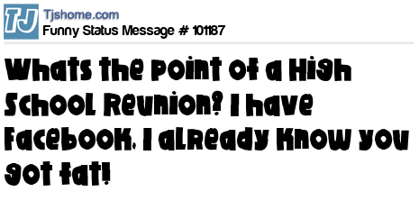 - # 107184 What's the point of a high school reunion? I have Facebook. I already know you got Fat