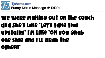 X We were making out on the couch and She's like "Let's take this upstairs" I'm like "Ok you grab one side and I'll grab the other!"