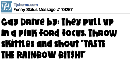 X is Gay Drive by: They pull up in a pink ford focus, Throw skittles and shout "TASTE THE RAINBOW BIT$H!"