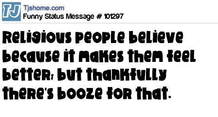 X says Religious people believe because it makes them feel better; but thankfully there's booze for that.