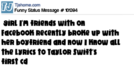 - # 75920 You know it's a bad break-up when your ex-girlfriend is posting Taylor Swift lyrics as her facebook status.