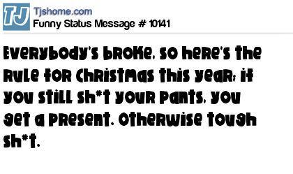 X says Everybody's broke, so here's the rule for Christmas this year; if you still sh*t your pants, you get a present. Otherwise tough sh*t.