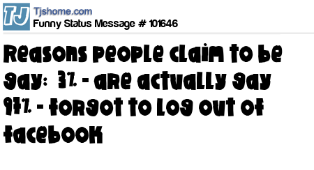 - # 102927 Reasons people claim to be gay: 3% - are actually gay 97% - forgot to log out of facebook
