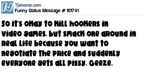 X So it's okay to kill hookers in video games, but smack one around in real life because you want to negotiate the price and suddenly everyone gets all pissy. Geeze.