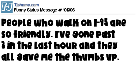 X People who walk on I-95 are so friendly. I've gone past 3 in the last hour and they all gave me the thumbs up.