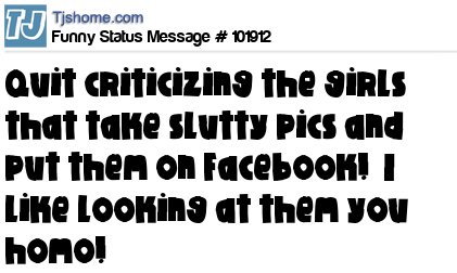 X quit criticizing the girls that take slutty pics and put them on Facebook! I like looking at them you homo!