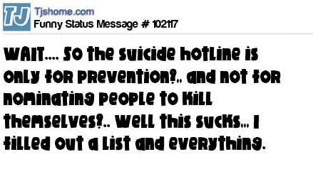 X WAIT.... So the suicide hotline is only for prevention?,, and not for nominating people to kill themselves?.. Well this sucks,,, I filled out a list and everything.