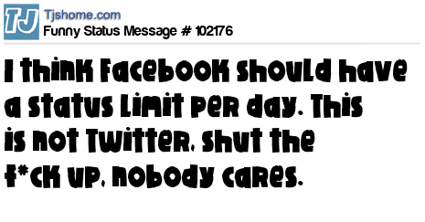 X I think Facebook should have a status limit per day. This is not Twitter, shut the f*ck up, nobody cares.