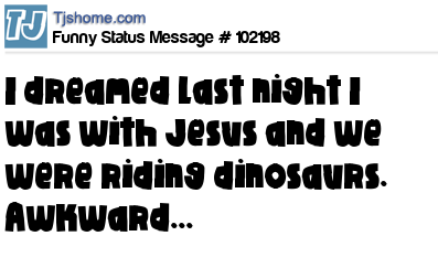 X I dreamed last night I was with Jesus and we were riding dinosaurs. Awkward...