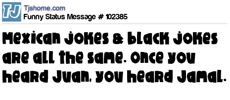 - # 86988 Mexican and black jokes are pretty much all the same. Once you've heard Juan, you've heard Jamal.