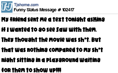 X  My friend sent me a text tonight asking if I wanted to go see Saw with them. They thought the movie was sh*t. But that was nothing compared to my sh*t night sitting in a playground waiting for them to show up!!!
