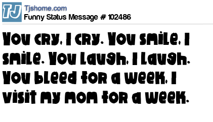X says You cry, I cry. You smile, I smile. You laugh, I laugh. You bleed for a week, I visit my mom for a week.