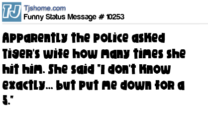 - # 10210 The police officer asked Tigers wife "how many times did you hit him ma'am?" She responded "Oh, I don't know, put me down for a 5"