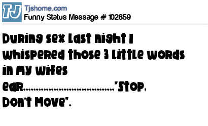 X During sex last night I whispered those 3 little words in my wifes ear...................................."Stop, Don't Move".
