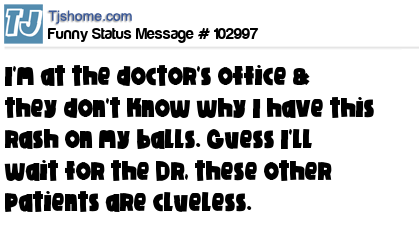 - # 99189 I'm at the doctor's office & they don't know why I have this rash on my balls. Guess I'll wait for the Doctor, these other patients are clueless.