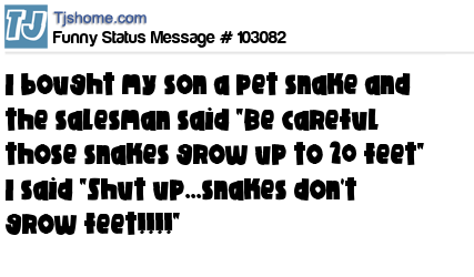 X is I bought my son a pet snake and the salesman said "Be careful those snakes grow up to 20 feet" I said "Shut up...snakes don't grow feet!!!!"