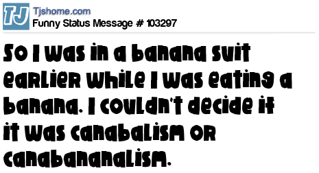 X says So I was in a banana suit earlier while I was eating a banana. I couldn't decide if it was canabalism or canabananalism.