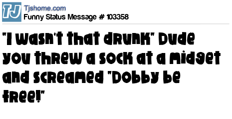 X is "I wasn't that drunk" Dude you threw a sock at a midget and screamed "Dobby be free!"