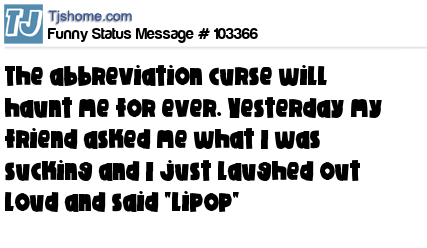 X says the abbreviation curse will haunt me for ever. Yesterday my friend asked me what I was sucking and I just laughed out loud and said "lipop"