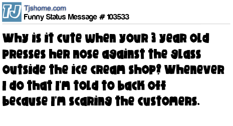 - # 103399 Why is it cute when your 3 year old presses her nose against the glass outside the ice cream shop? Whenever I do that I'm told to back off because I'm scaring the customers