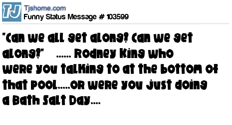 X "Can we all get along? Can we get along?" ...... Rodney King who were you talking to at the bottom of that pool.....or were you just doing a Bath Salt Day....