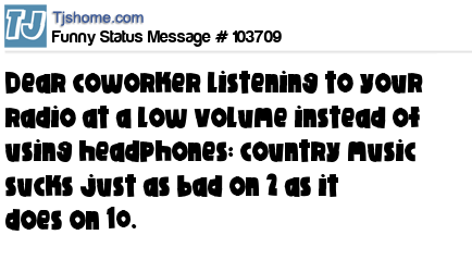 X says Dear coworker listening to your radio at a low volume instead of using headphones: country music sucks just as bad on 2 as it does on 10.