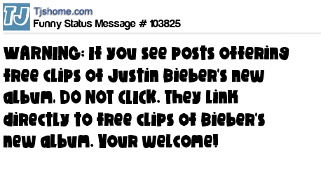 X WARNING: If you see posts offering free clips of Justin Bieber's new album, DO NOT CLICK. They link directly to free clips of Bieber's new album. Your welcome!