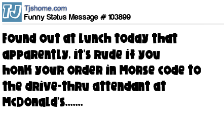 X Found out at lunch today that apparently, it's rude if you honk your order in Morse code to the drive-thru attendant at McDonald's.......