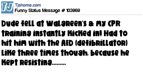 X Dude fell at Walgreen's & my CPR training instantly kicked in! Had to hit him with the AED (defibrillator) like three times though, because he kept resisting.........