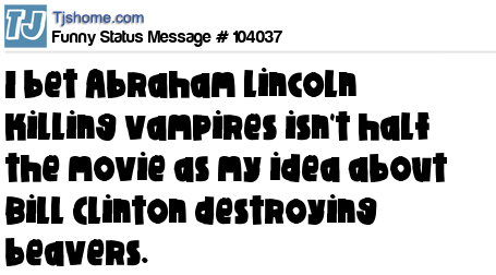 - # 103898 I bet Abraham Lincoln killing vampires isn't half as good as the movie I just made up about Bill Clinton beaver Destroyer.