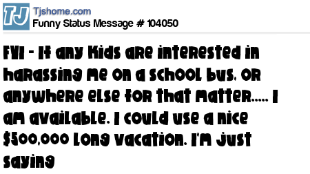 X says FYI - If any kids are interested in harassing me on a school bus, or anywhere else for that matter..... I am available. I could use a nice $500,000 long vacation. I'm just saying