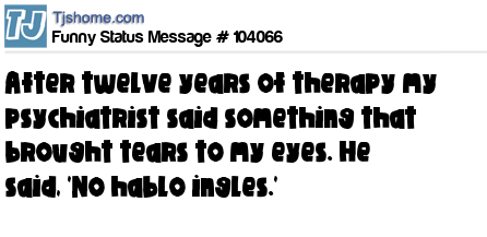X says After twelve years of therapy my psychiatrist said something that brought tears to my eyes. He said, 'No hablo ingles.'