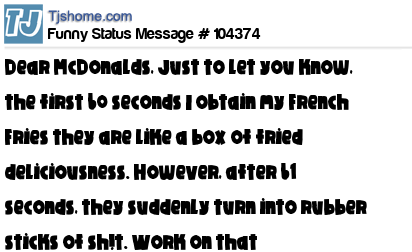 X Dear McDonalds, Just to let you know, the first 60 seconds I obtain my French Fries they are like a box of fried deliciousness. However, after 61 seconds, they suddenly turn into rubber sticks of sh!t. Work on that