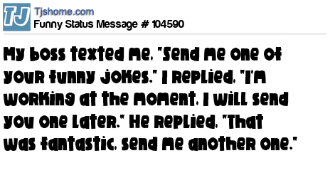 X My boss texted me, "Send me one of your funny jokes." I replied, "I'm working at the moment, I will send you one later." He replied, "That was fantastic, send me another one."
