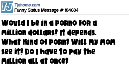X Would I be in a porno for a million dollars? It depends. What kind of porn? Will my mom see it? Do I have to pay the million all at once?