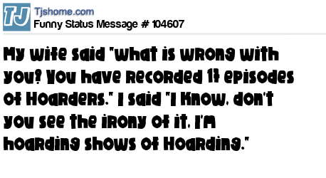 X My wife said "what is wrong with you? You have recorded 17 episodes of Hoarders." I said "I know, don't you see the irony of it, I'm hoarding shows of Hoarding."
