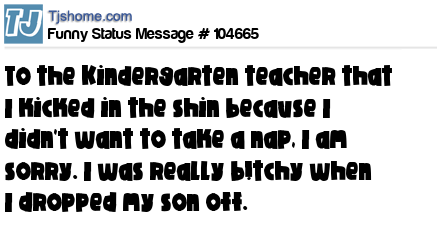 X To the Kindergarten teacher that I kicked in the shin because I didn't want to take a nap, I am sorry. I was really b!tchy when I dropped my son off.