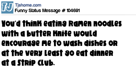 X says You'd think eating Ramen noodles with a butter knife would encourage me to wash dishes or at the very least go eat dinner at a Strip Club.