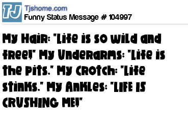 X My Hair: "Life is so wild and free!" My Underarms: "Life is the pits." My Crotch: "Life stinks." My Ankles: "LIFE IS CRUSHING ME!"