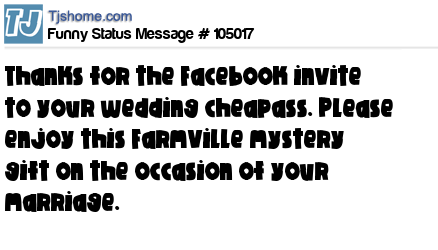 X says Thanks for the Facebook invite to your wedding cheapass. Please enjoy this FarmVille mystery gift on the occasion of your marriage.